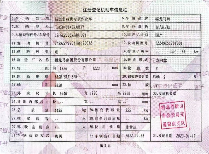 2023年1月,福龍馬新能源洗掃車,新能源(純電),1水2塵,75千瓦,自動擋,2850軸距,公司用車,底盤配置,