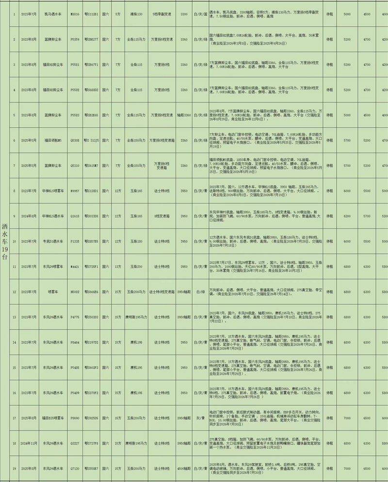 可租賃車(chē)型:全新或二手灑水車(chē)、洗掃車(chē)、清洗吸污車(chē)、高壓清洗車(chē)、吸糞車(chē)、掃路車(chē)、對(duì)接垃圾車(chē)、壓縮垃圾車(chē)、無(wú)泄漏自裝卸垃圾車(chē)、